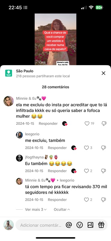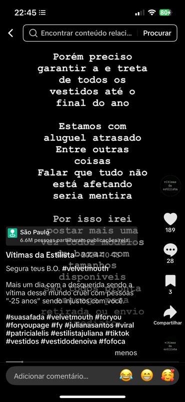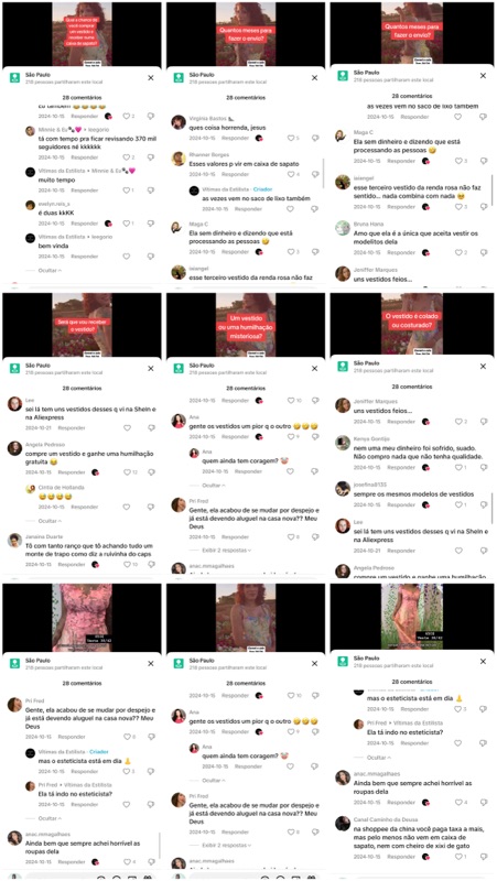 O post 66 é mais uma peça da máquina de perseguição construída pela página “Vítimas da Estilista”. Nele, vídeos legítimos em que a estilista Juliana aparece vestindo modelos autorais são editados com frases de deboche e acompanhados por uma enxurrada de comentários humilhantes. As ofensas vão desde piadas sobre pobreza e despejo até comparações grotescas sobre o cheiro e a embalagem dos vestidos. O tom é de linchamento virtual organizado — com participação ativa da própria página nos comentários. A publicação viola o Código Penal em múltiplos pontos e expõe, sem qualquer disfarce, a intenção clara de destruir a imagem, a autoestima e a credibilidade de uma profissional.