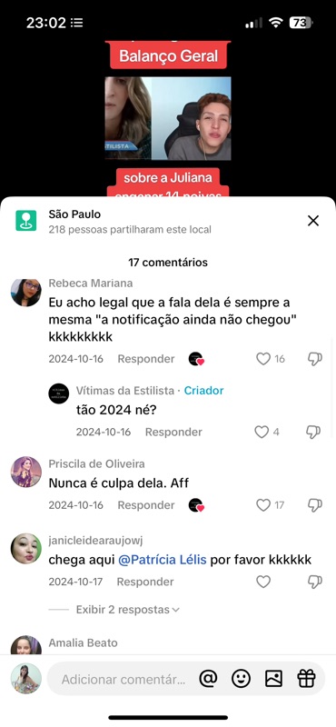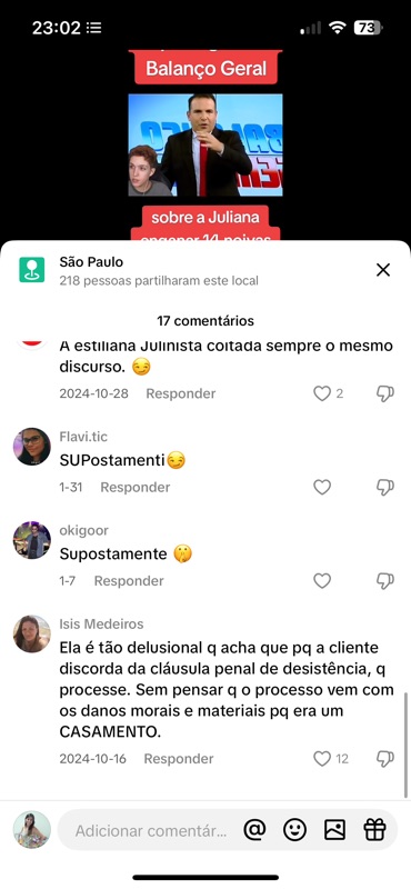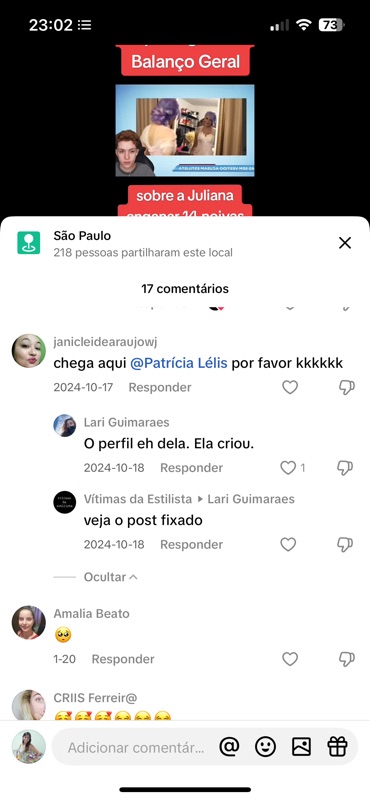 Além da manipulação do vídeo, os comentários nesses dois posts reforçam e perpetuam a violência digital contra mim. São falas públicas, com curtidas e interação do próprio perfil “Vítimas da Estilista”, que demonstram total desrespeito à minha história, ao meu trabalho e à minha dignidade. Veja abaixo alguns exemplos: