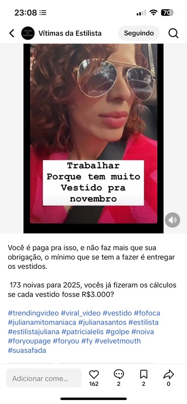 - Manipulação de números: A legenda atribui à estilista um número de contratos jamais declarado (173 noivas). Esse dado é falso. Após os cancelamentos, o número real para 2025 era de 66 contratos ativos.