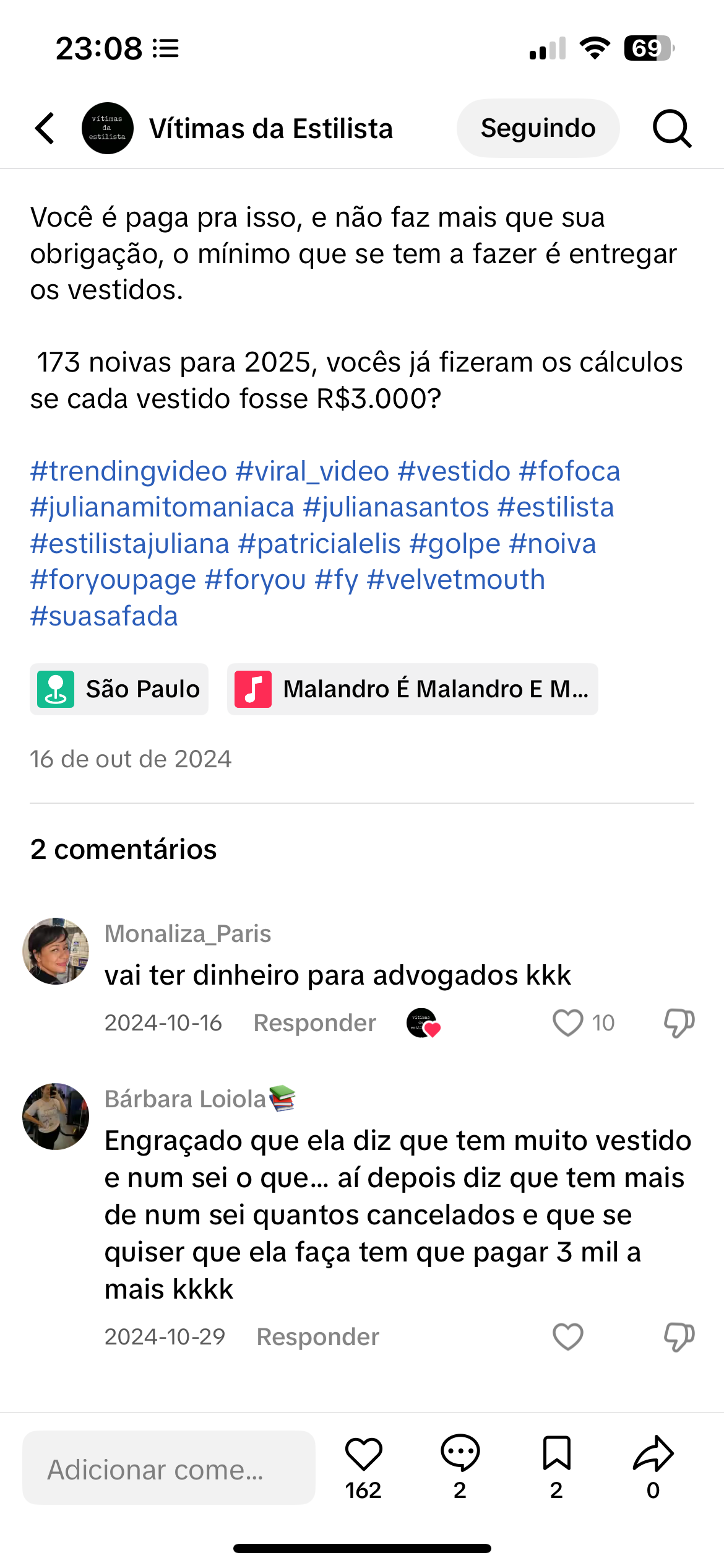 - A legenda distorce a lógica do funcionamento do ateliê, desconsiderando que boa parte dos contratos são pagos com antecedência (ainda em 2023 e 2024), e que a estilista teve que lidar com cancelamentos em massa gerados por ataques como este.