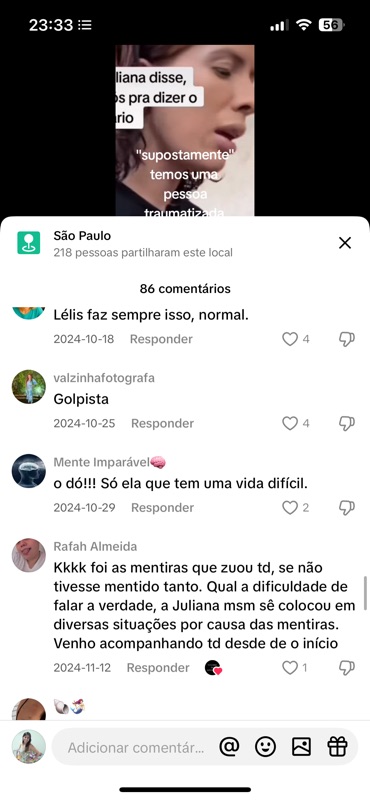 A página pega três vídeos diferentes, de épocas distintas da minha vida, recorta apenas as falas que interessam à narrativa delas, junta tudo em menos de um minuto e publica como se fosse uma “prova” de que eu sou mitomaníaca, que tenho problemas psicológicos graves, que sou incapaz de falar a verdade.
