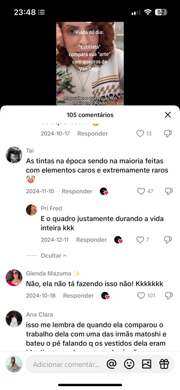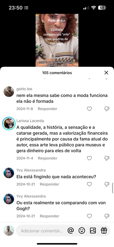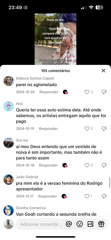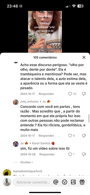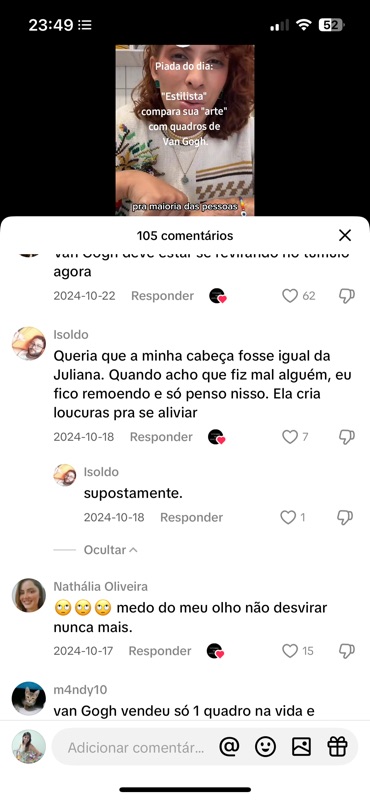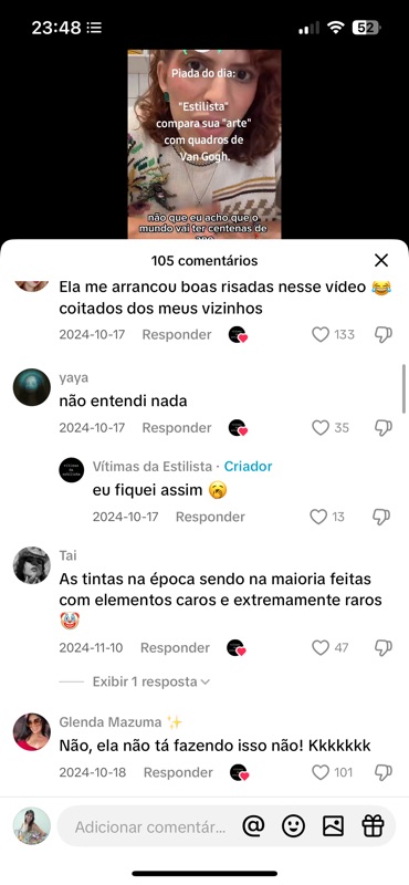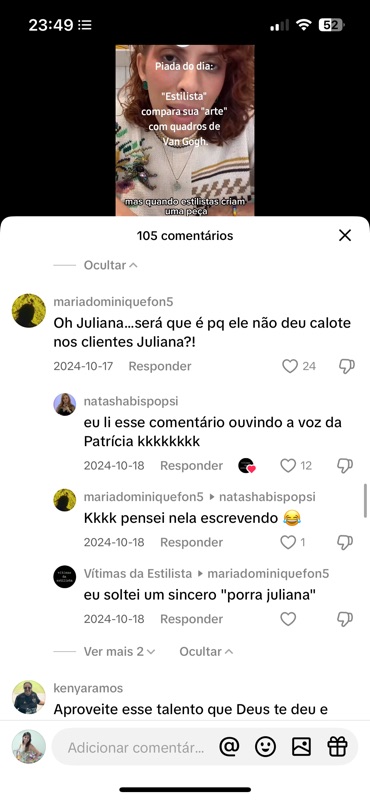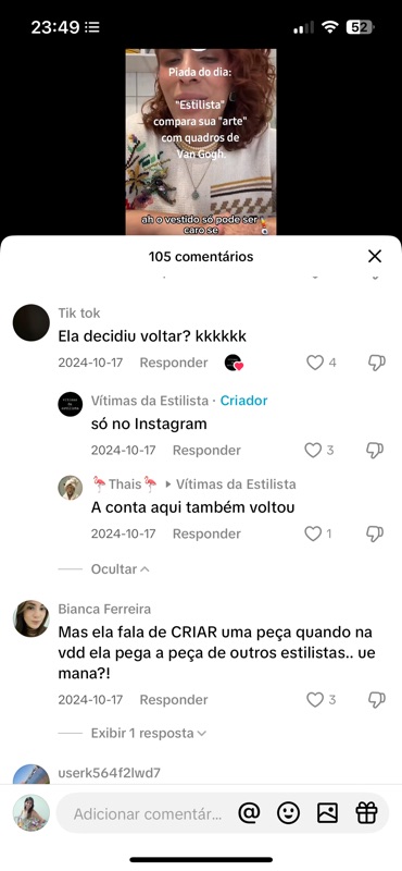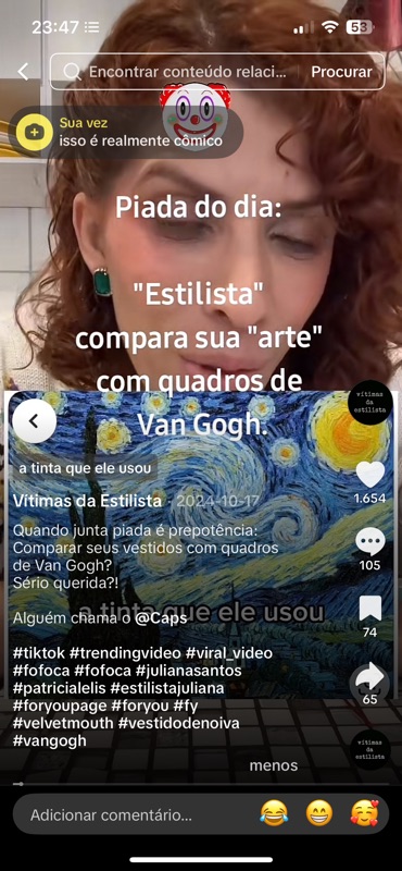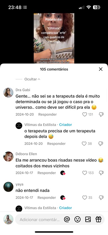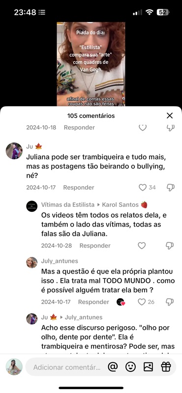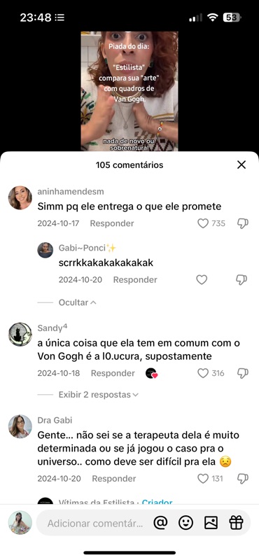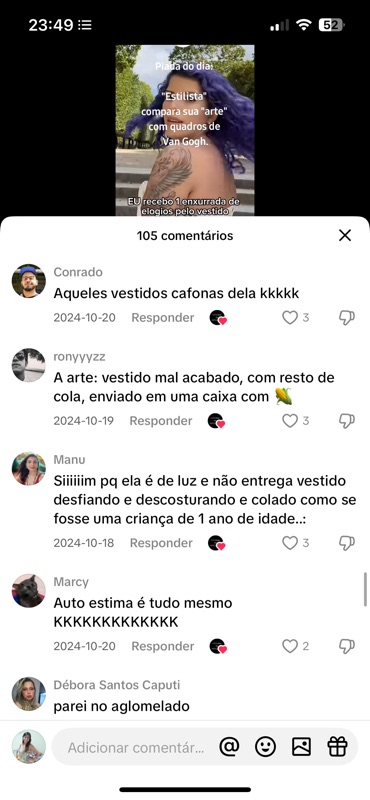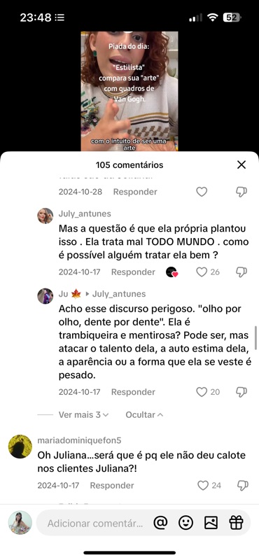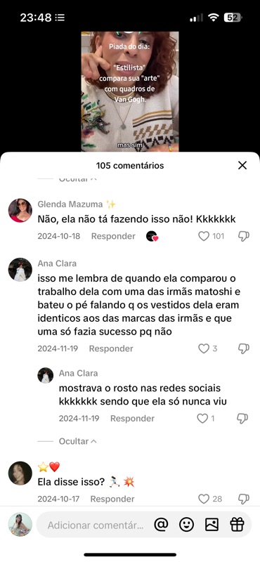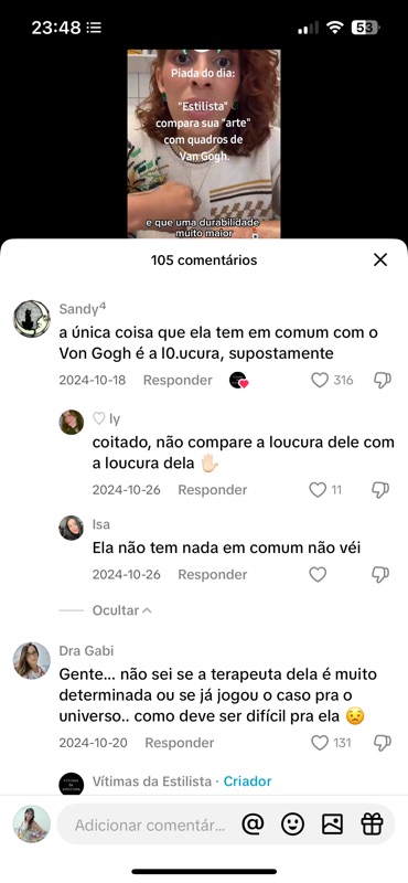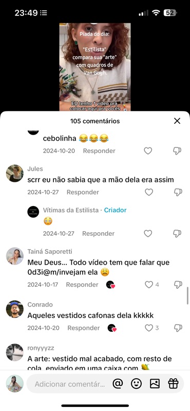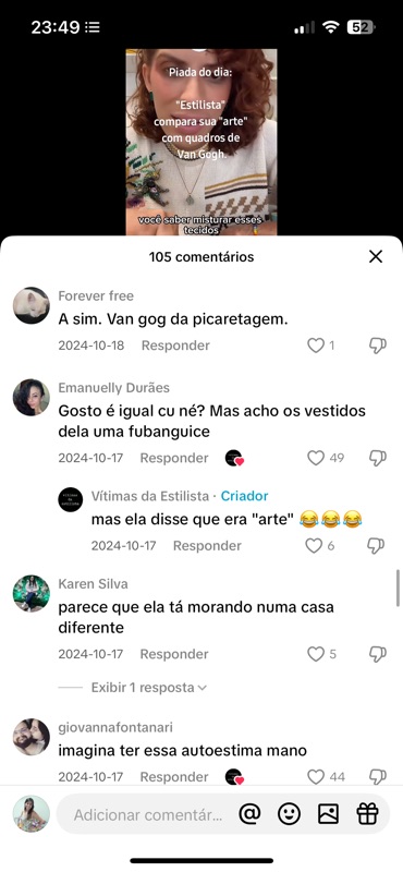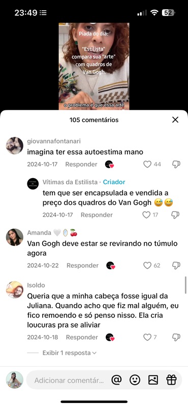 Em 17 de outubro de 2024, a página “Vítimas da Estilista” publicou mais um vídeo com o claro intuito de promover o escárnio e a humilhação pública, desta vez utilizando como base um story em que falo sobre o valor simbólico e afetivo das criações autorais — comparando a resiliência da arte à resistência emocional de quem a cria. A página editou o conteúdo, adicionou trilha sonora debochada, cortes sensacionalistas e, na legenda, distorceu completamente o sentido da fala, sugerindo que eu me comparava diretamente a Van Gogh, num delírio narcisista.