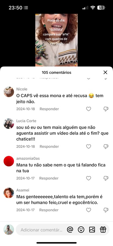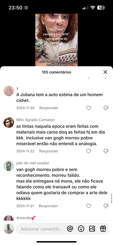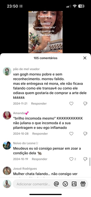 Lembro perfeitamente do dia em que gravei aquele stories. Eu falava sobre Van Gogh, sobre como ele foi desvalorizado em vida, como a sua arte transcendeu a sua própria época e só muito tempo depois passou a ser reconhecida. E, como de costume, não demorou para aquele vídeo parar na página de ataques. Transformaram minhas palavras em piada, distorceram tudo, e mais de 105 comentários surgiram para simplesmente acabar comigo.