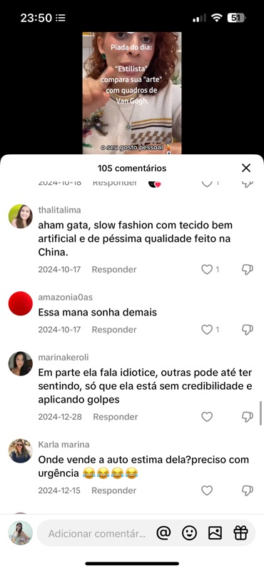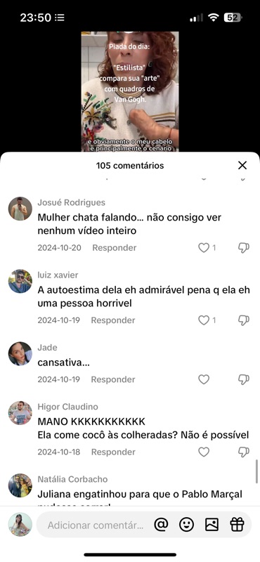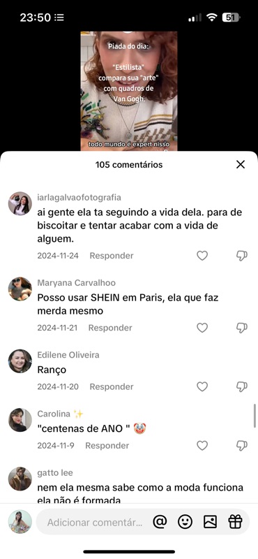 Comentários com termos ofensivos e debochados sobre meus vestidos e sobre mim enquanto estilista:
