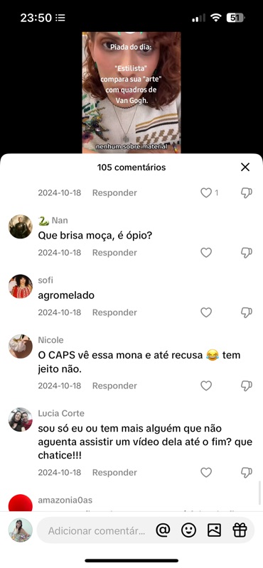 Múltiplos comentários fizeram piada com possíveis transtornos mentais, sugerindo que eu deveria estar internada ou que vivo em delírio: