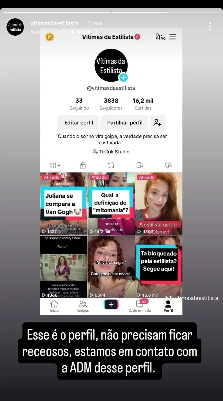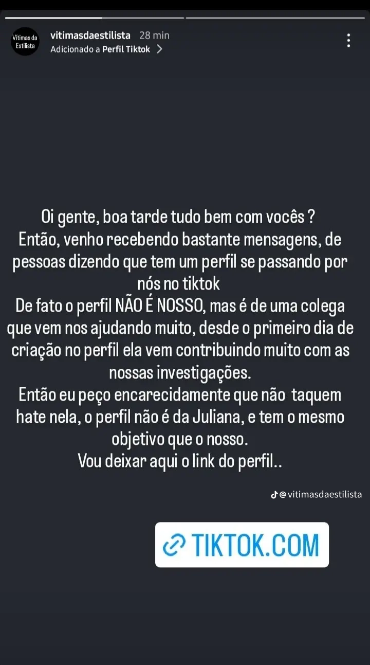 O Post 90 marca uma fase importante da construção da rede de ataques organizada contra mim. Neste conteúdo, as administradoras do “Vítimas da Estilista” explicam sobre um perfil no TikTok, supostamente de uma “colega” que, segundo elas, estaria apenas “colaborando nas investigações”, mas na prática faz parte do mesmo núcleo de produção de conteúdo difamatório, fortalecendo o engajamento entre as páginas.