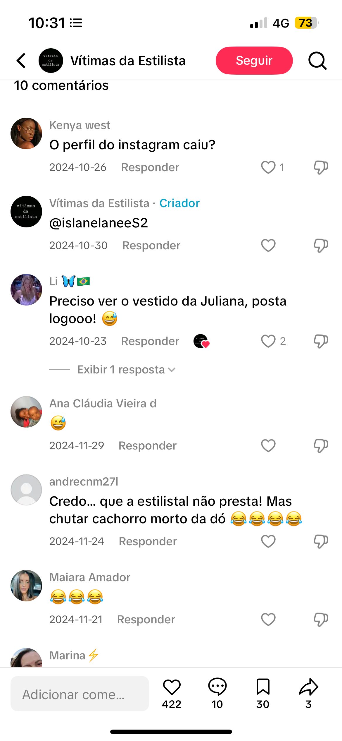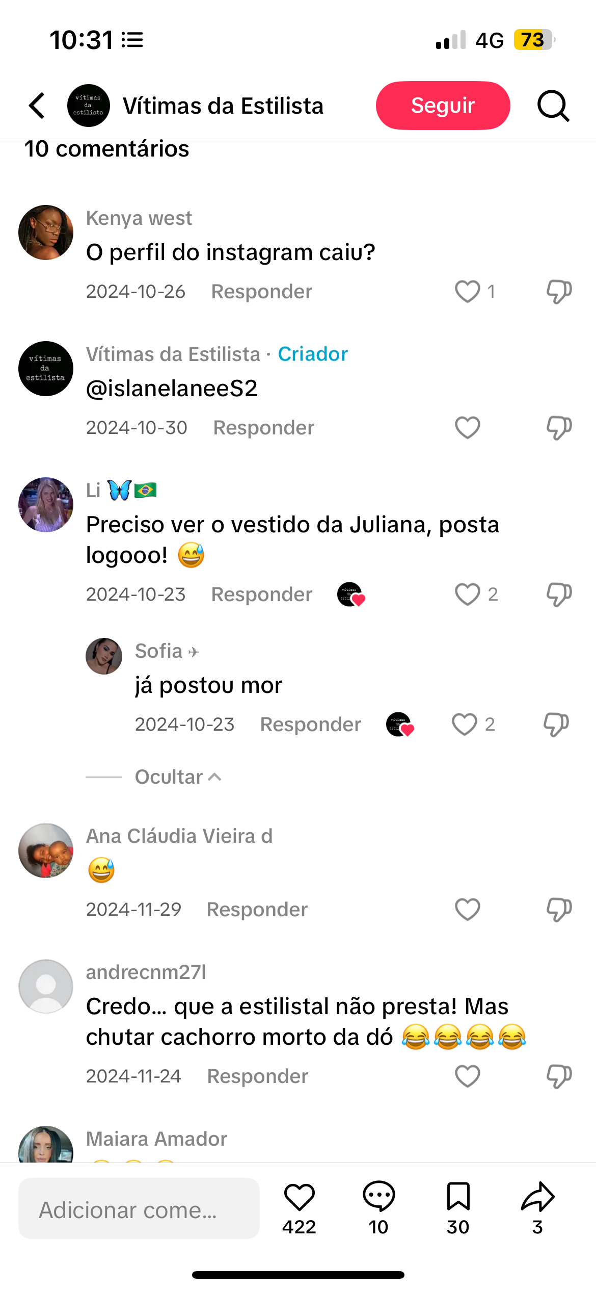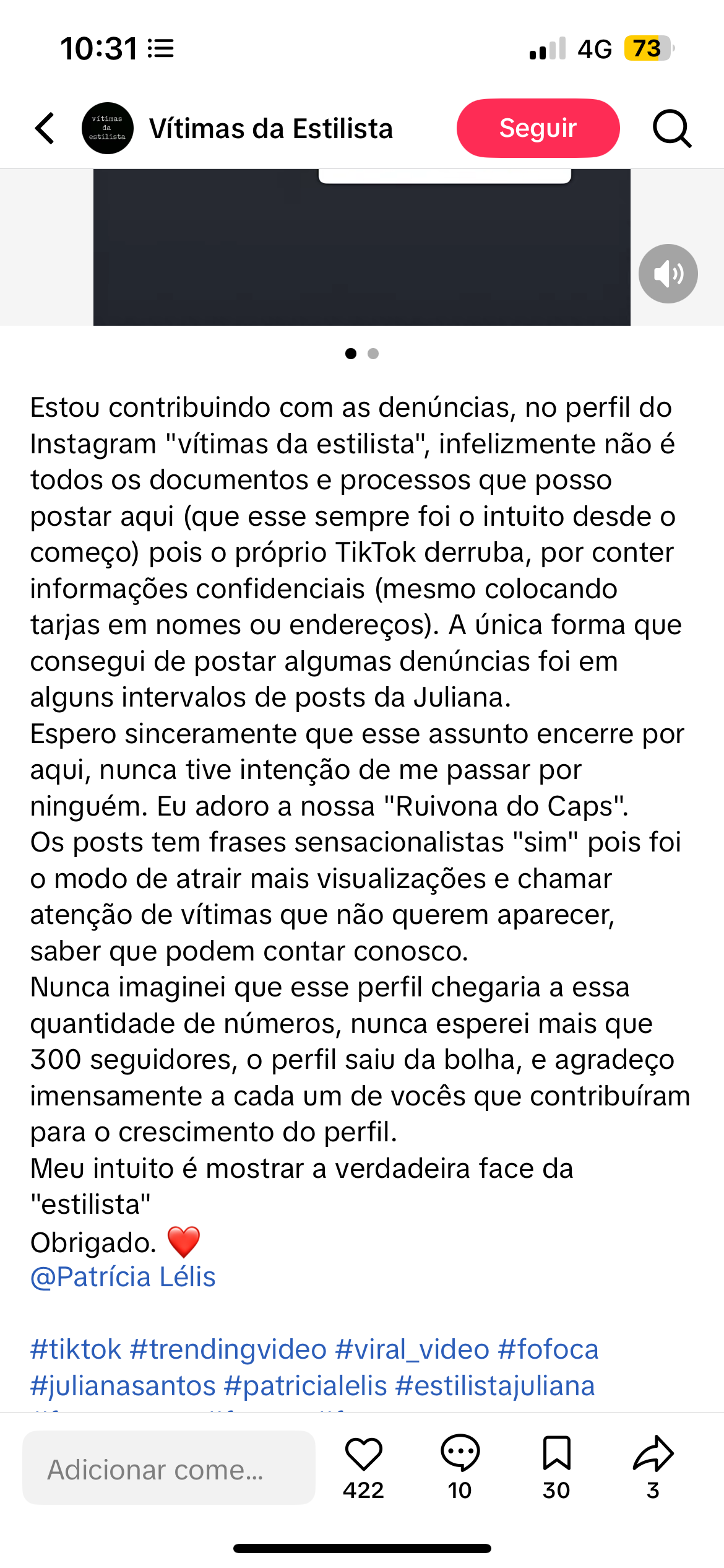 Chama atenção o trecho em que afirma que só posta denúncias “em alguns intervalos de posts da Juliana”, ou seja, admite que monitora e utiliza meu conteúdo como matéria-prima para alimentar o ciclo de ataques. Ela ainda declara que seu objetivo é “mostrar a verdadeira face da estilista”, ou seja, um julgamento sumário sem direito de defesa, sustentado apenas por versões distorcidas e comentários de ódio.