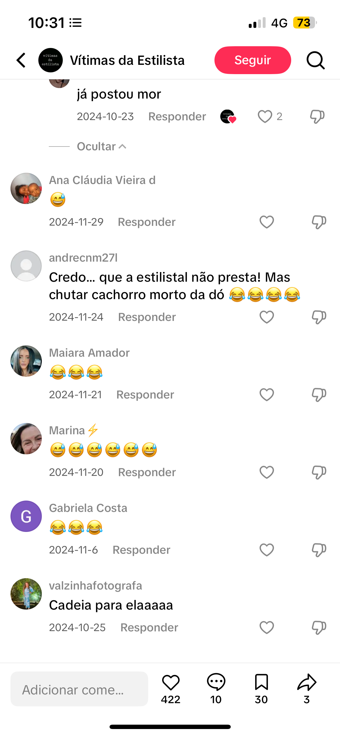- Injúria e difamação: Comentários como “que a estilista não presta”, “chutar cachorro morto dá dó”, além de emojis de deboche, reforçam a humilhação pública e a tentativa de desumanizar a vítima.