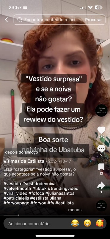 O conteúdo do post? Um vídeo com minha fala tirada totalmente fora de contexto, para alimentar mais uma “narrativa sensacionalista” do tipo “vestido surpresa” — como se a cliente nunca soubesse o que vai receber, o que não condiz com a realidade de nenhum atendimento sério e profissional. No texto e nas legendas, apenas ironias: “E se a noiva não gostar?”, “Ela pode fazer um review do vestido?”, “Boa sorte noivinha de Ubatuba”.