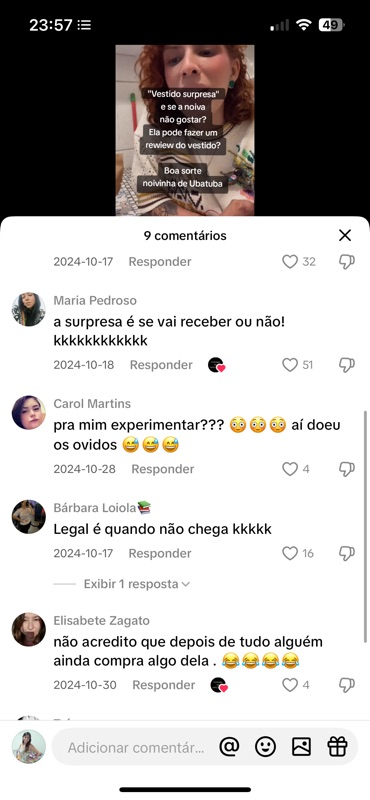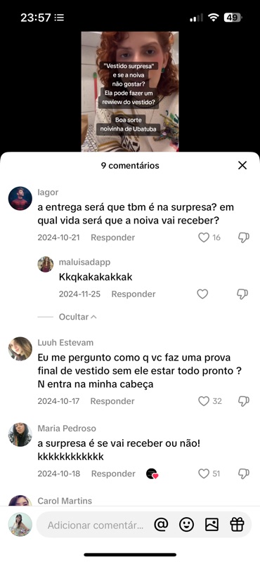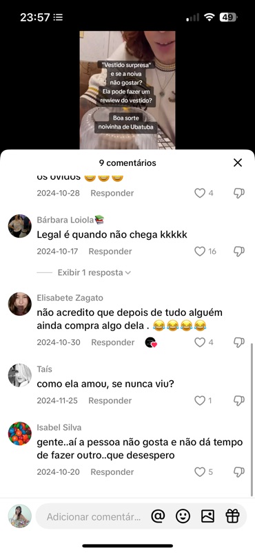 Além de debochar sobre o processo criativo, as pessoas questionam a entrega dos vestidos, duvidam da existência de provas e basicamente torcem publicamente pelo fracasso do atendimento — tudo alimentado pela legenda e pela curadoria da página.