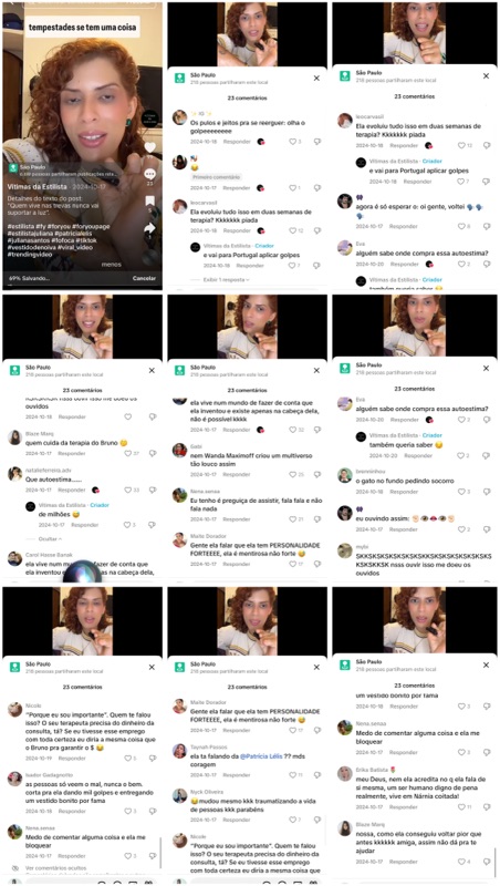 - Difamação e injúria: Comentários e legendas que afirmam que eu sou golpista, mentirosa, incapaz, doente mental, reforçando estigma e afetando minha reputação.