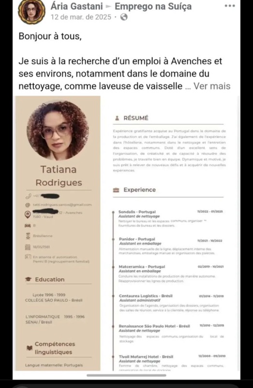 Esse documento foi postado publicamente por ela no dia 12 de março de 2025, na busca por vagas de faxina e lavação de louça em Avenches. A postagem, feita em francês, não deixa dúvidas quanto à sua identidade.