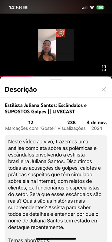 A live foi intitulada “Contratos Abusivos de Juliana Santos: Advogada Explica os Direitos das Clientes!”, um exemplo claro de sensacionalismo direcionado para gerar ódio e desconfiança sobre meu trabalho. A descrição do vídeo reforça a acusação de “práticas abusivas”, afirma que clientes devem aprender a identificar cláusulas ilegais em contratos e cita meu nome repetidas vezes, sem apresentar qualquer decisão judicial, denúncia formal ou prova concreta que sustente essas alegações.