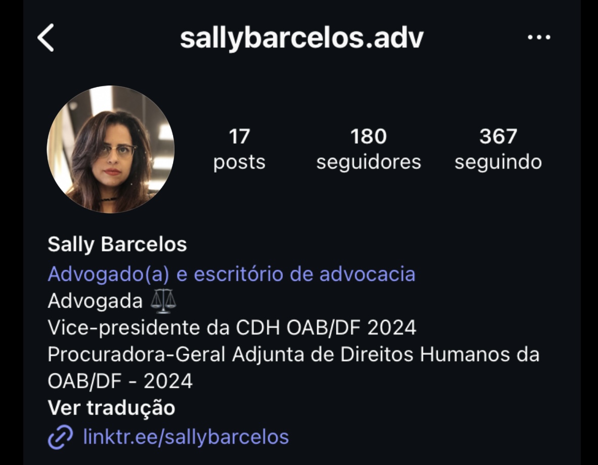 A identificação da advogada Sally Barcelos, que aparece na live difamatória e cuja atuação já vinha sendo questionada, agora é confirmada a partir das informações públicas de seu próprio perfil profissional. Sally não é apenas advogada, mas Vice-presidente da Comissão de Direitos Humanos (CDH) da OAB/DF para o ano de 2024 e também Procuradora-Geral Adjunta de Direitos Humanos da mesma instituição no mesmo período.