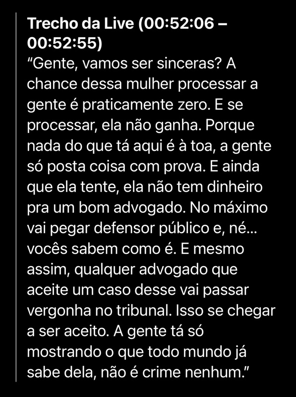 “Gente, vamos ser sinceras? A chance dessa mulher processar a gente é praticamente zero. E se processar, ela não ganha. Porque nada do que tá aqui é à toa, a gente só posta coisa com prova. E ainda que ela tente, ela não tem dinheiro pra um bom advogado. No máximo vai pegar defensor público e, né… vocês sabem como é. E mesmo assim, qualquer advogado que aceite um caso desse vai passar vergonha no tribunal. Isso se chegar a ser aceito. A gente tá só mostrando o que todo mundo já sabe dela, não é crime nenhum.”