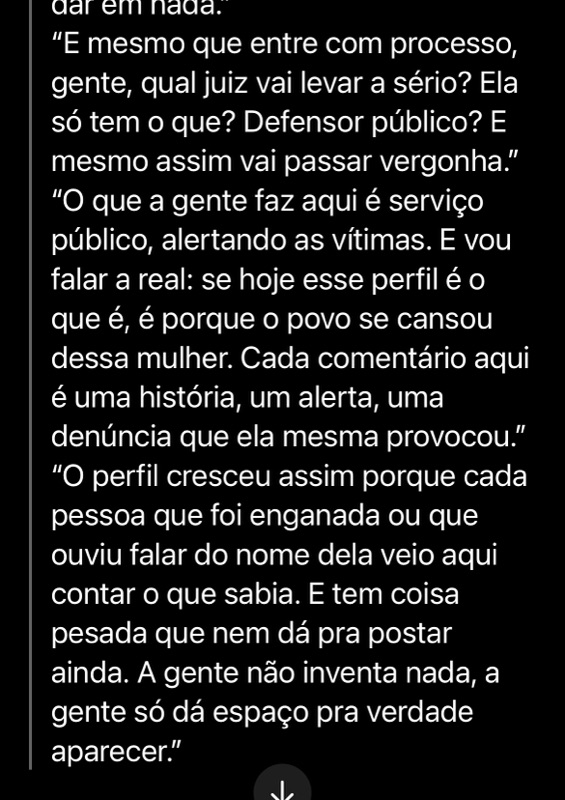 “O perfil cresceu assim porque cada pessoa que foi enganada ou que ouviu falar do nome dela veio aqui contar o que sabia. E tem coisa pesada que nem dá pra postar ainda. A gente não inventa nada, a gente só dá espaço pra verdade aparecer.”
