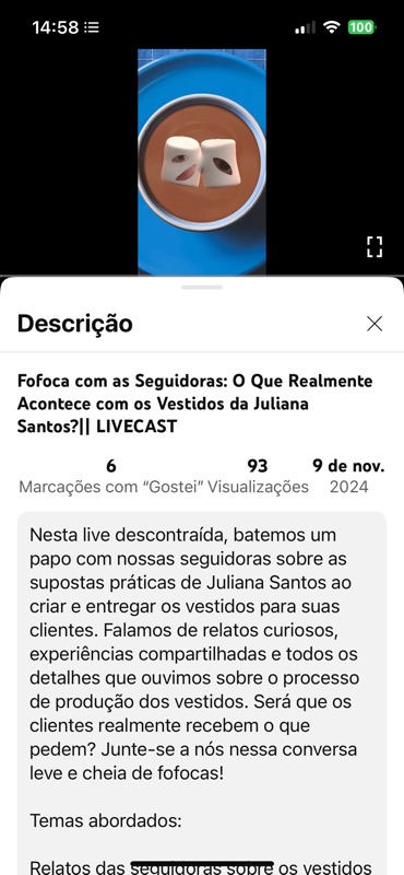 Na terceira live da playlist, encontramos mais um exemplo claro da estratégia de difamação orquestrada contra mim. A legenda utilizada já antecipa o teor malicioso do conteúdo: “Fofoca com as Seguidoras: O Que Realmente Acontece com os Vestidos da Juliana Santos? || LIVECAST”. A escolha das palavras não é inocente. O termo “fofoca” é usado como chamariz para atrair curiosidade e dar a entender que existem segredos ou irregularidades envolvendo meu trabalho. Ao mesmo tempo, a frase “o que realmente acontece com os vestidos” insinua que existe algo oculto ou duvidoso nos processos do meu ateliê, alimentando desconfiança sem apresentar qualquer prova concreta.