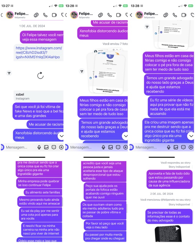 Mas, meses depois, quando o caso da Bell explodiu, tudo voltou como uma avalanche. Julho de 2024. Meus filhos dentro de casa, de férias, e eu recebendo mensagens de ódio que não desejo para ninguém. Ameaças de morte, gente me dizendo para me matar, mensagens capacitistas num nível que eu nunca tinha visto na vida. Tudo isso porque uma influenciadora da sua agência, Felipe, pegou áudios meus, distorceu cada palavra, construiu uma narrativa falsa para se passar de vítima, e soltou essa bomba nas redes.