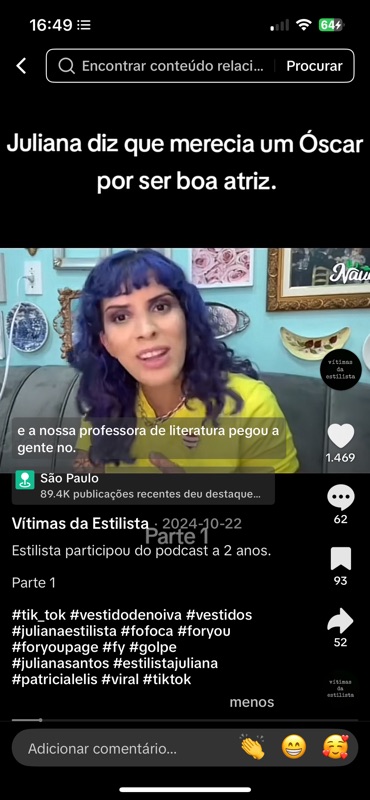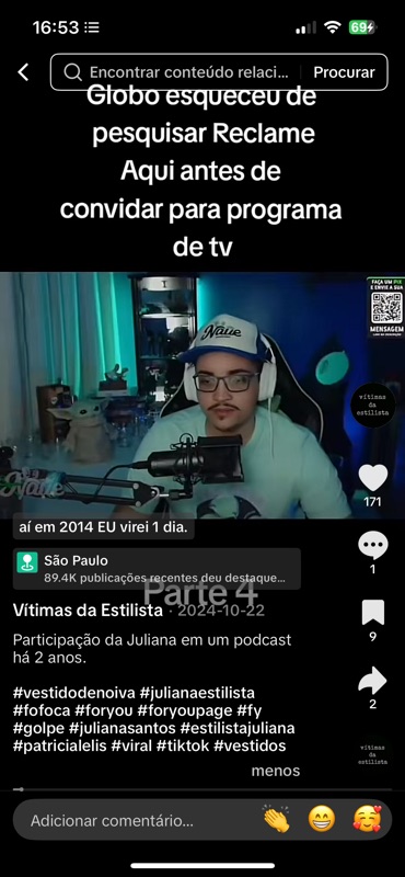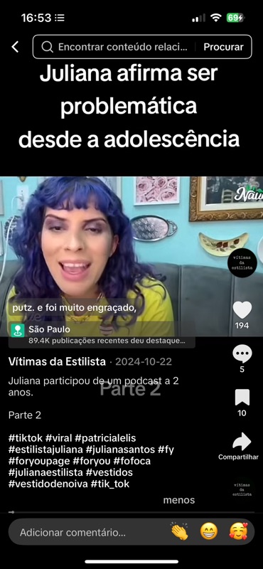 Esse post é um exemplo clássico do método stalker usado pelo perfil “Vítimas da Estilista”: elas vasculham o YouTube em busca de qualquer participação minha em entrevistas ou podcasts, recortam falas fora de contexto e publicam na página para distorcer completamente a narrativa original. Neste caso, usaram um trecho de um podcast que gravei entre 2021 e 2022, numa conversa leve sobre a minha trajetória, juventude, histórias engraçadas e aprendizados pessoais, para criar uma sequência de posts (partes 1 a 5) que serviram apenas para me ridicularizar e alimentar mais ódio nos comentários.
