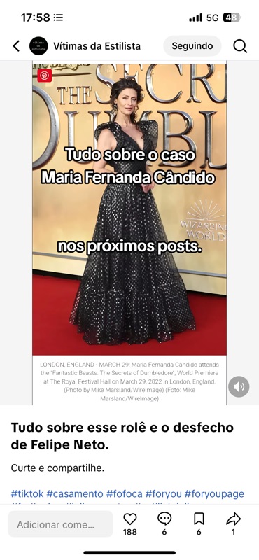 A legenda do post segue o padrão sensacionalista do perfil “Vítimas da Estilista”, usando expressões como “Tudo sobre esse rolê e o desfecho de Felipe Neto”, misturando temas e nomes de celebridades para gerar curiosidade e engajamento. O objetivo é óbvio: criar uma narrativa de fofoca, como se houvesse um “bastidor proibido” ou uma briga envolvendo nomes famosos, quando, na realidade, tratam-se de distorções de situações profissionais mal resolvidas. A utilização de hashtags como #fofoca, #foryou, #tiktok e #casamento reforça o interesse em viralizar o conteúdo a qualquer custo, mesmo que isso prejudique a reputação de terceiros e dissemine fake news.