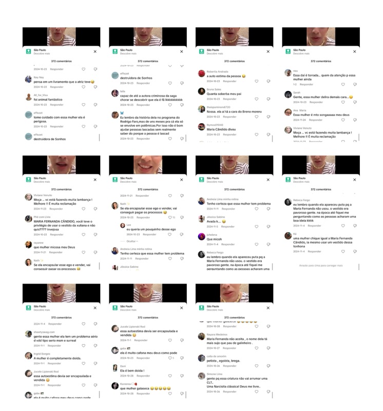 Neste bloco, os comentários atingem o ápice da crueldade e humilhação, com ataques explícitos à autoestima, à aparência física, à saúde mental e à reputação profissional. O padrão segue igual: comentários agressivos, humilhantes, machistas e capacitistas — todos amplificados por curtidas e respostas da própria página “Vítimas da Estilista”.