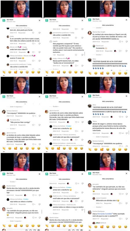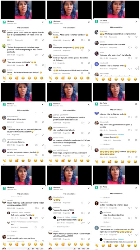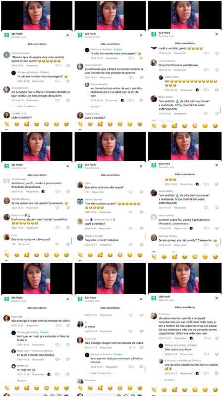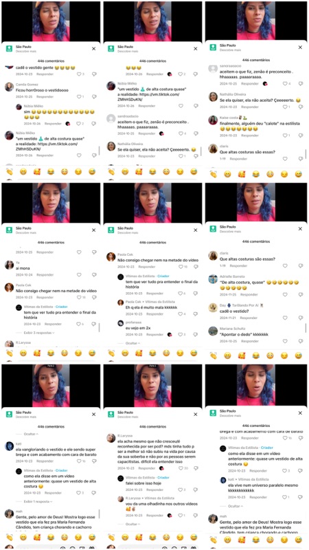 - Difamação coletiva, onde minha credibilidade como estilista é atacada sem qualquer base ou contraponto, reforçando rótulos depreciativos (“mentirosa”, “iludida”, “estilista internacional” em tom de deboche, entre outros);