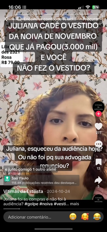 O vídeo foi retirado de contexto e usado para criar uma narrativa falsa, insinuando que eu teria deixado de entregar um vestido de uma noiva de novembro porque ela não teria pago um valor extra de 3 mil reais – uma acusação totalmente inventada, sem qualquer prova. Esse é um exemplo clássico da estratégia de difamação: pegar um vídeo original, que não tem absolutamente nenhuma relação com a história narrada na legenda, e usá-lo para espalhar boatos, criando suspense e incentivando comentários ofensivos.