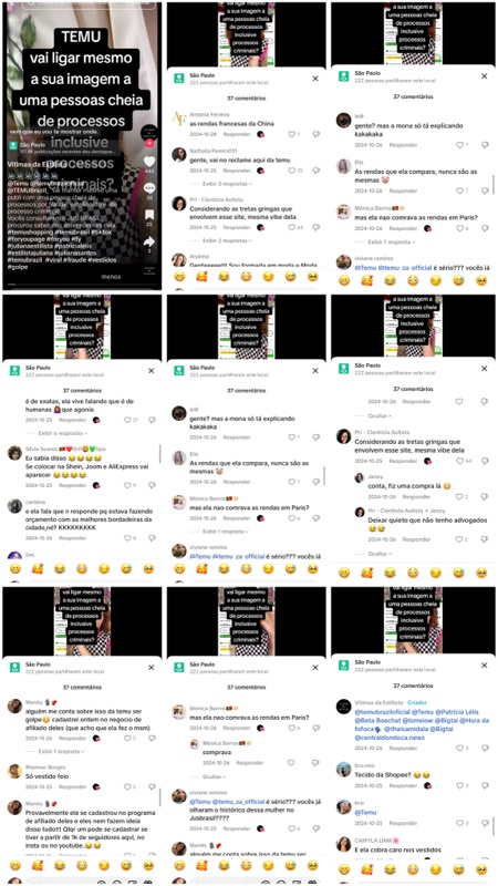 - Boicote comercial e incitação ao ódio: Marcação direta da Temu e influenciadores de fofoca para ampliar a perseguição, buscando fechamento de portas profissionais da vítima.