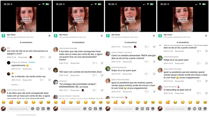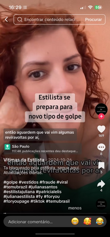 - Hashtags: #golpe #vestidos #fraude #viral #temubrazil #julianasantos #estilistajuliana #patricialelis #julianaestilista #fy #foryou #tiktok #temubrasil