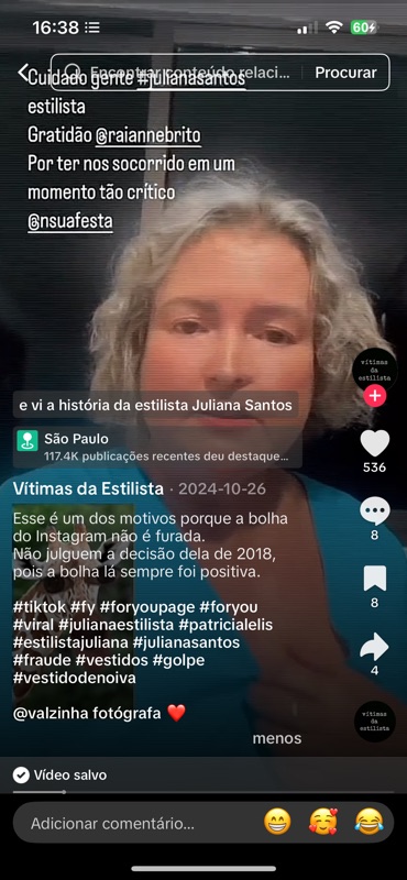 O vídeo do Post 172 é protagonizado por Val Simões, fotógrafa que me persegue desde 2016 com comentários difamatórios, chamando-me de “golpista” em diversas redes sociais. Val já criou perfis falsos, participou do grupo organizado em 2018 para difamar minha reputação e segue propagando mentiras sobre um contrato firmado em 2016 para o vestido de noiva da filha.