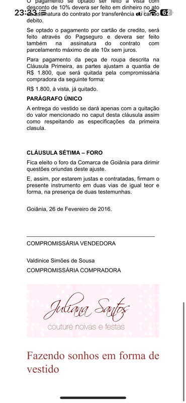 “Em 2018, depositei R$ 3.800 para Juliana Santos fazer o vestido da minha filha e da mãe da noiva. Ela nunca entregou e ficamos sem vestido, sendo socorridas por outra loja.”