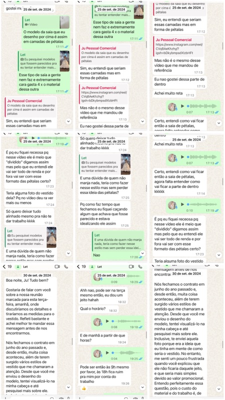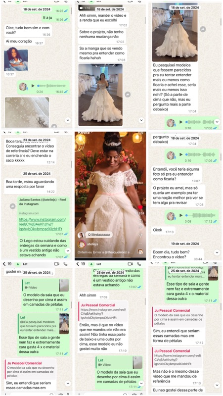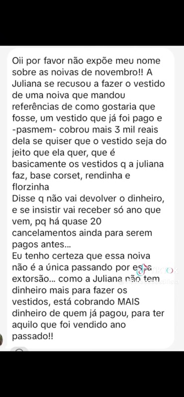 “Juliana, e o vestido da noiva de novembro? A noiva comprou um vestido, pagou três mil reais e te deu as referências de como ela queria o vestido. E você disse não, que só faria o vestido se fosse do seu jeito, com corset, flores e borboletas. A cliente disse não. A noiva pediu dinheiro de volta e você disse não, que se ela quisesse o dinheiro de volta, teria que esperar 20 noivas que estavam para receber. E agora, Juliana? Como a noiva vai se casar? Eu vou expor o relato da noiva de novembro. E aguardo a sua manifestação. Obrigada.”