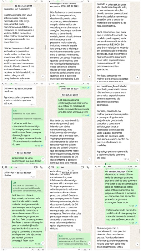 - Um dia antes, Letty pediu o cancelamento para garantir 50% de reembolso, previsto em contrato para desistências antes dessa etapa (após a retirada de medidas, a multa seria de 70%).