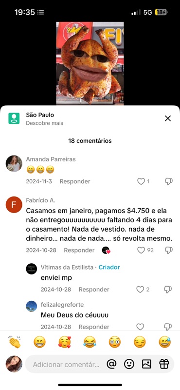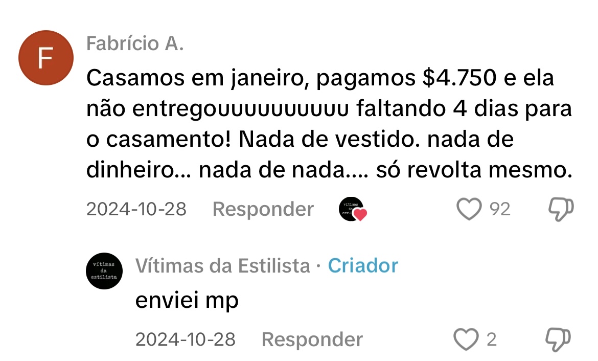 Esse comentário foi curtido dezenas de vezes e reforçou a narrativa falsa criada pela página “Vítimas da Estilista” de que eu aplico golpes, recebo valores sem entregar vestidos e deixo noivas sem resposta. A verdade é completamente diferente e precisa ser registrada aqui, com todos os detalhes.