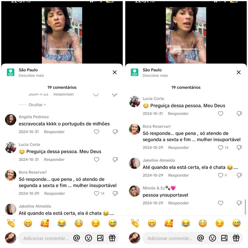 - Há incitação ao ódio coletivo, com usuários zombando da estilista, chamando-a de preguiçosa, insuportável, golpista, e colocando em dúvida sua ética profissional.