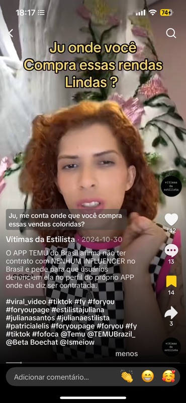 Este post é mais um exemplo claro de como a perseguição contra mim ultrapassa qualquer limite ético ou moral. Aqui, elas alegam que eu não teria parceria com o aplicativo Temu e que isso seria o “meu novo golpe”. A narrativa criada não só é absurda como também não faz sentido dentro da lógica do próprio mercado digital.