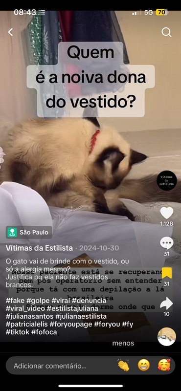 👁🗨 Contexto visual: Vídeo mostrando um gato siamês deitado sobre um tecido branco em uma superfície plana, com legenda sarcástica sobre “alergia” e “brinde com o vestido”.