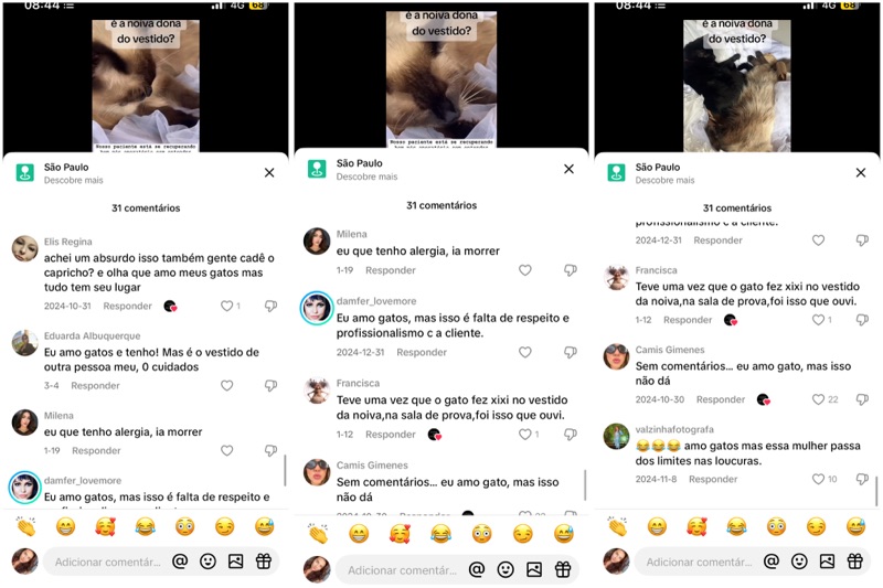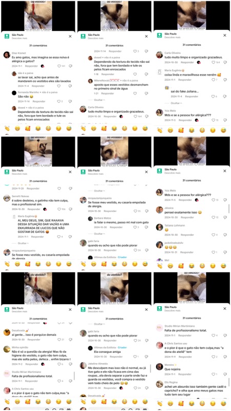 Esse post é um claro exemplo de perseguição e distorção de uma realidade privada e cotidiana, transformada artificialmente em “prova” de má conduta profissional. A presença do gato sobre tecidos caseiros é usada de maneira sensacionalista para incitar comentários de repulsa e alimentar o linchamento virtual.