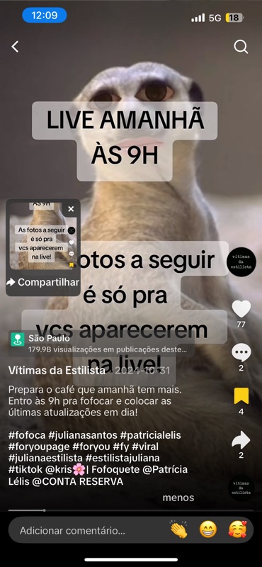 O vídeo anuncia uma live marcada para o dia seguinte às 9h da manhã, com a seguinte frase sobreposta à imagem de um animal (suricata ou similar, usada com tom irônico):