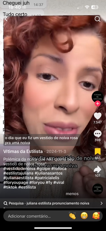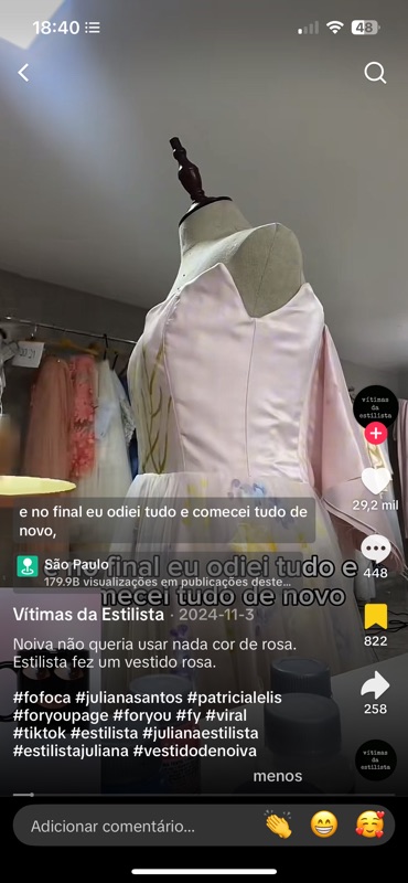 O resultado foi a criação de um bordão repetido em outros posts e comentários: “Ela fez o vestido rosa pra noiva que não queria rosa”. Esse é um exemplo direto de difamação por omissão de contexto, alimentando a perseguição e reforçando uma imagem distorcida do meu trabalho.