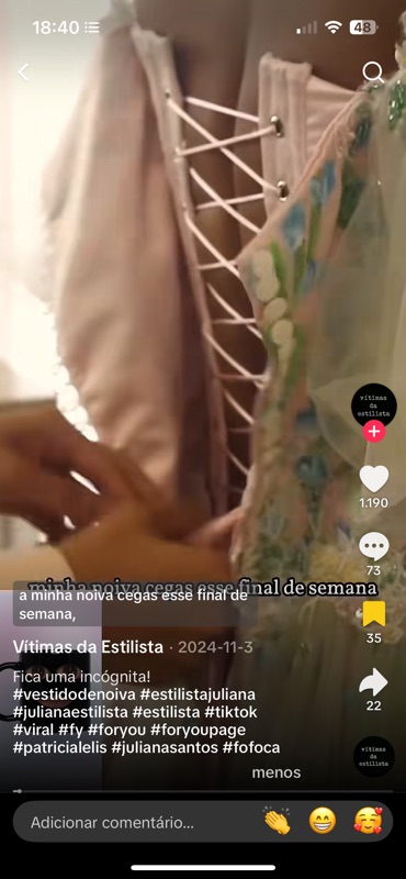 A Laysa em momento algum denunciou-me para a página “Vítimas da Estilista” ou autorizou o uso de sua imagem para qualquer fim que não fosse a divulgação em minha empresa e nas minhas redes sociais. Nas minhas plataformas, ela nunca sofreu hate. Pelo contrário: este mesmo vídeo ultrapassou 1 milhão de visualizações no meu TikTok, com centenas de comentários elogiando o vestido e a própria noiva. Isso porque, como administradora e moderadora, sempre mantive um ambiente saudável, não aprovando comentários ofensivos ou depreciativos.