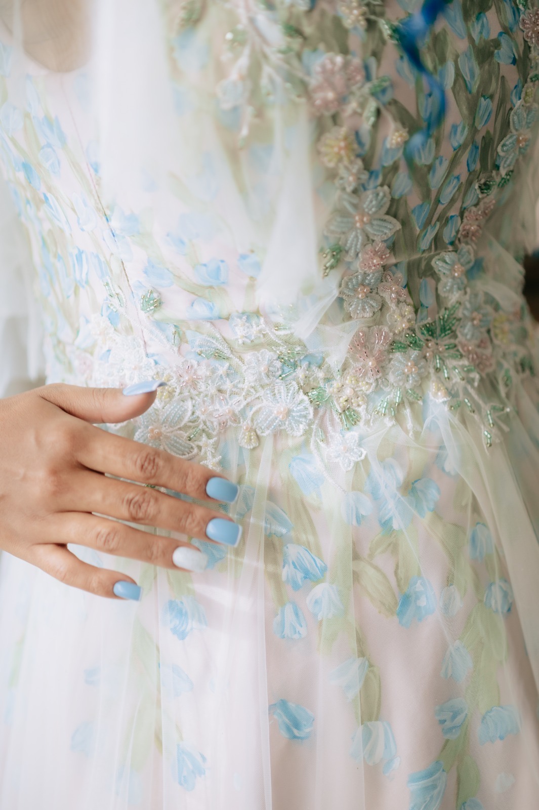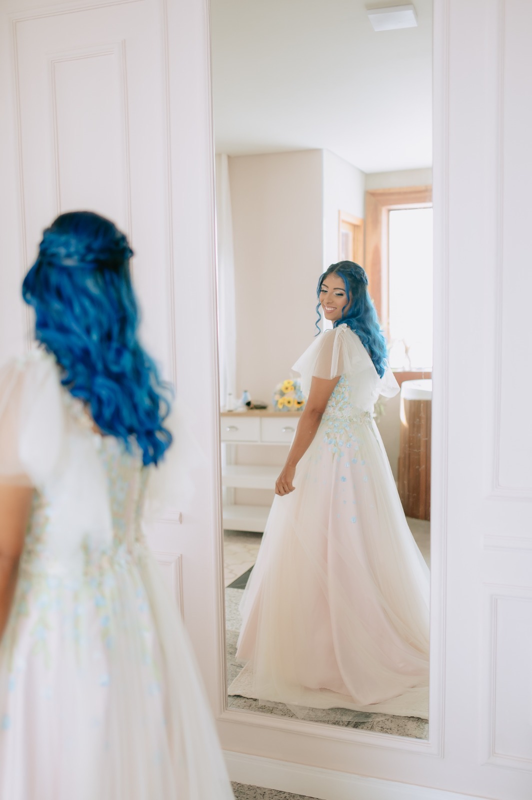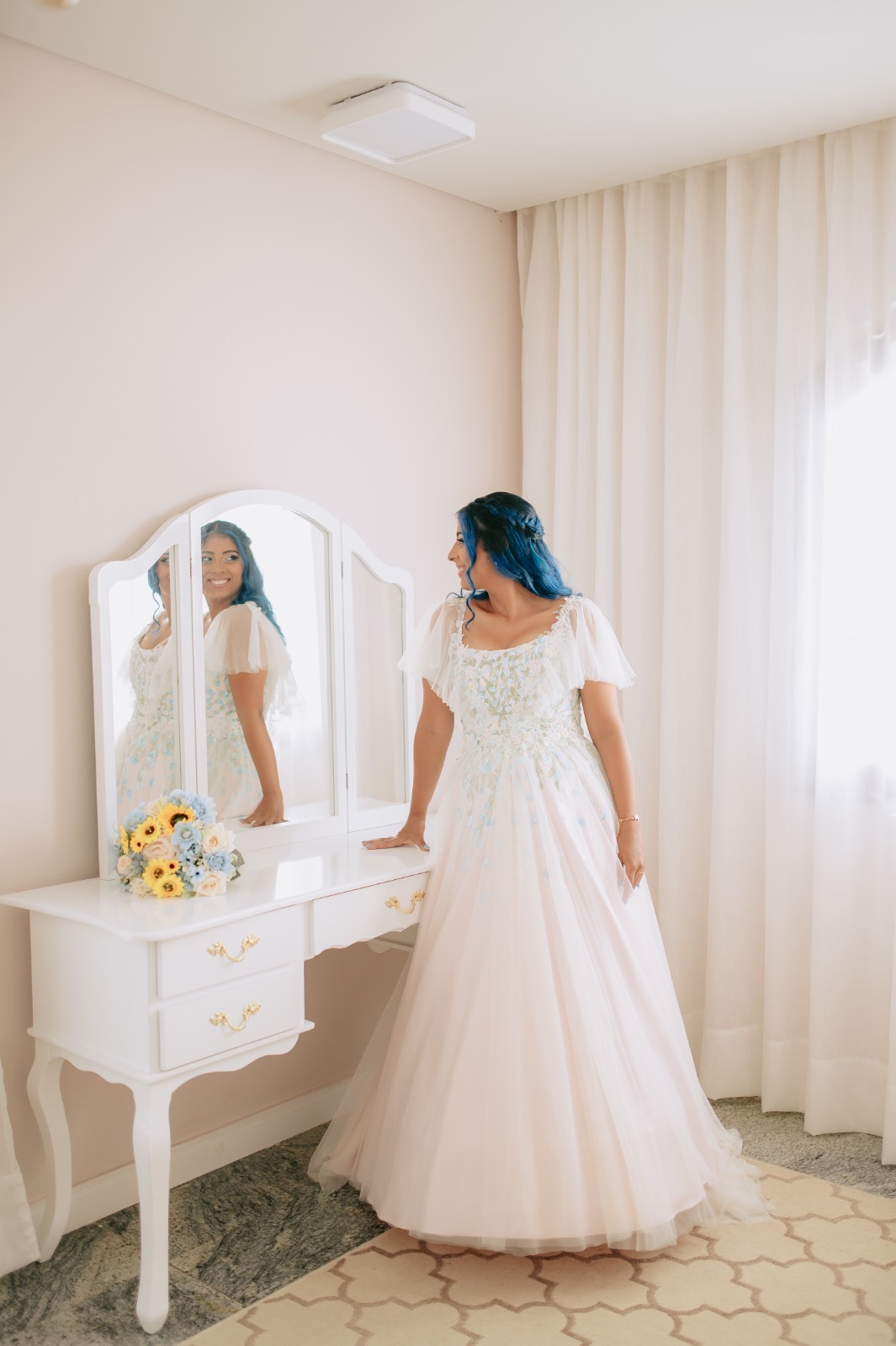Laysa foi uma Noiva Cegas de 2024, uma história da qual me orgulho profundamente. Ela desejava um vestido azul e, ao preencher o formulário de inscrição, indicou que a única cor de que não gostava era rosa. Durante o processo criativo, segui uma orientação pessoal e espiritual — algo que sempre fez parte do meu método autoral — que me levou a escolher um fundo rosa claro com detalhes azuis para o vestido.