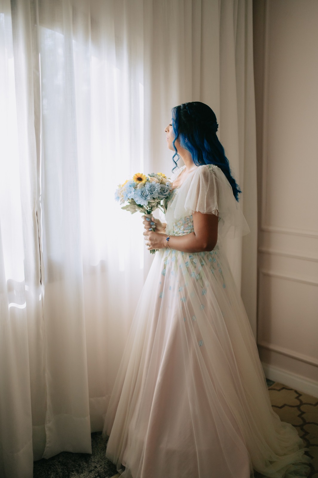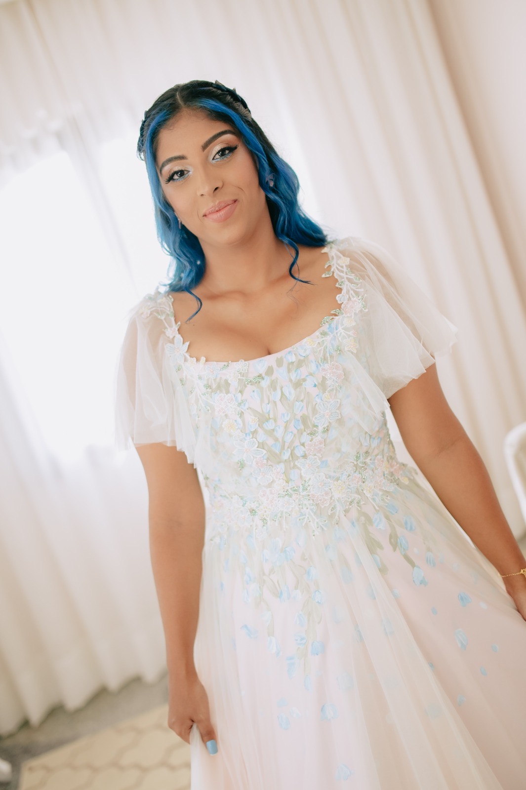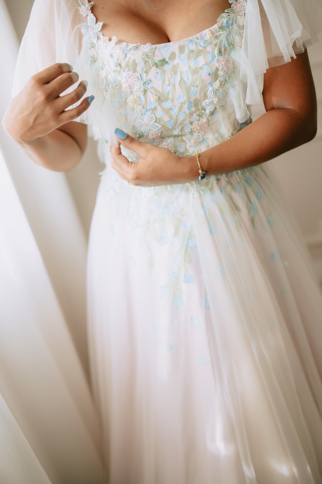 Laysa foi uma Noiva Cegas de 2024, uma história da qual me orgulho profundamente. Ela desejava um vestido azul e, ao preencher o formulário de inscrição, indicou que a única cor de que não gostava era rosa. Durante o processo criativo, segui uma orientação pessoal e espiritual — algo que sempre fez parte do meu método autoral — que me levou a escolher um fundo rosa claro com detalhes azuis para o vestido.