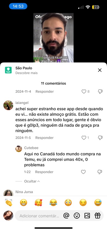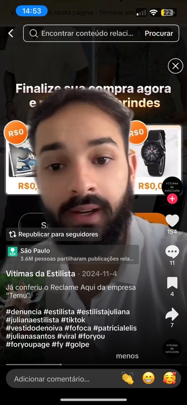 - Formato: Vídeo de um homem comentando sobre reclamações no Reclame Aqui contra o aplicativo de compras “Temu”.