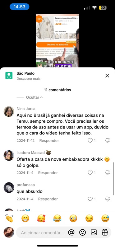 - Nos comentários, alguns usuários reforçam a narrativa de “golpe”, enquanto outros defendem a plataforma Temu, demonstrando que parte do público percebe a postagem como irrelevante ou enganosa.