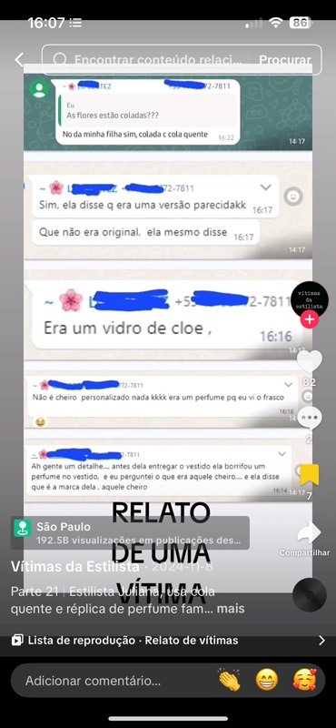 O Post 130 demonstra o nível de banalização e perseguição contra a estilista. Até mesmo o simples ato de borrifar perfume em um vestido foi transformado em acusação de crime, quando se trata de prática absolutamente comum no setor de moda e varejo. O objetivo é claro: ridicularizar e descredibilizar, usando comentários ofensivos que extrapolam qualquer crítica legítima e passam a configurar calúnia e difamação.