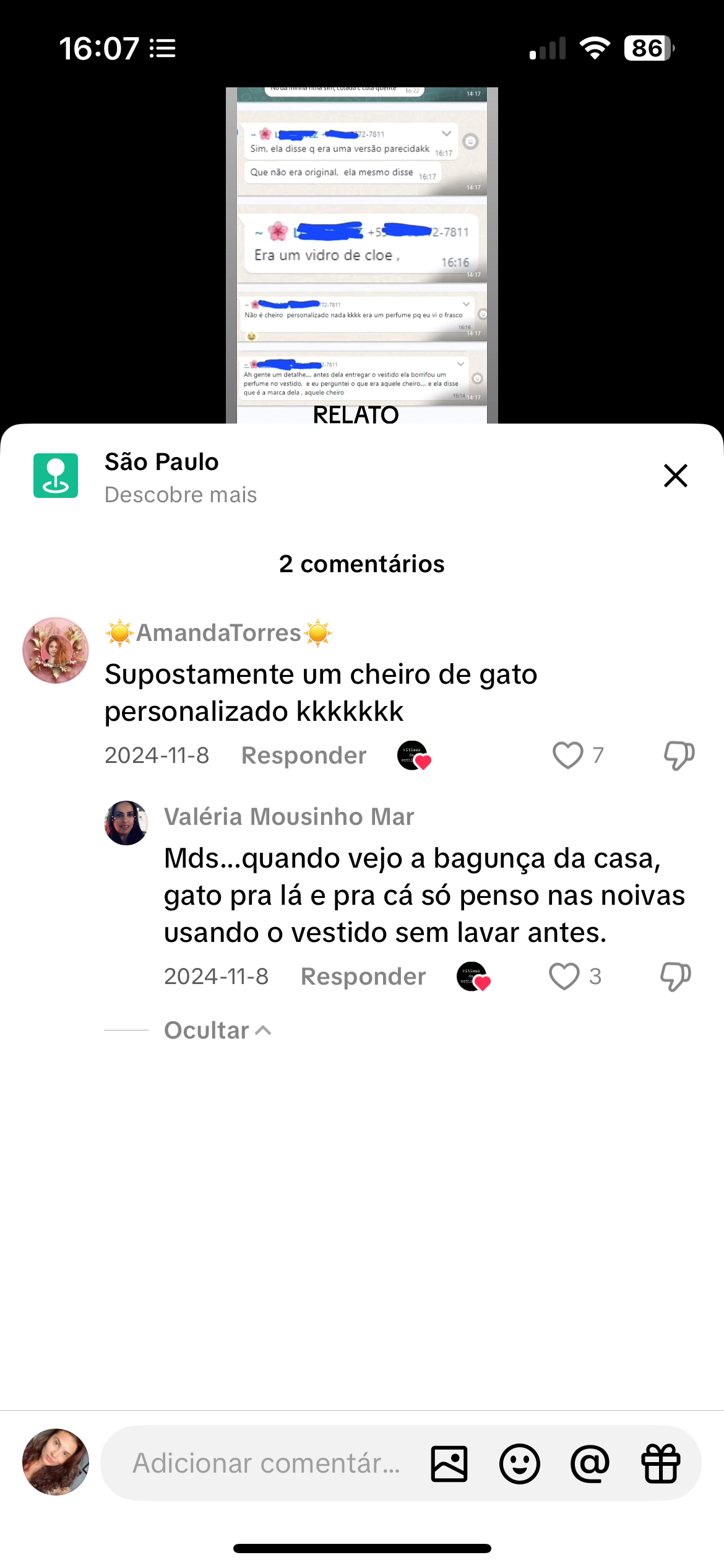 - Comentário 1: debocha chamando de “cheiro de gato personalizado”, com evidente escárnio.