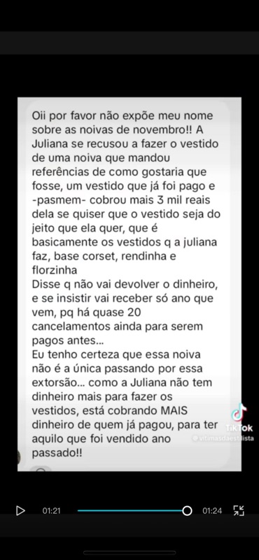 - Diz que Juliana informou que, se insistisse, a cliente só receberia o vestido ou o valor em 2025, pois havia “mais de 20 cancelamentos na frente”.