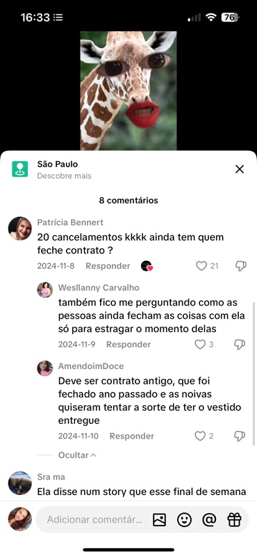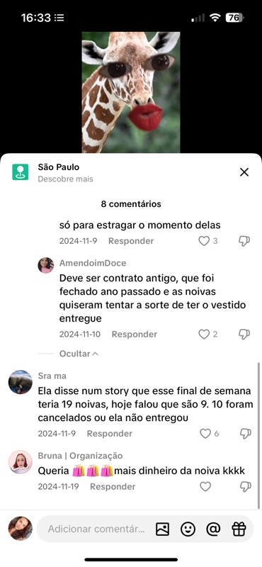 - “Ela disse num story que esse final de semana teria 19 noivas, hoje falou que são 9. 10 foram cancelados ou ela não entregou”