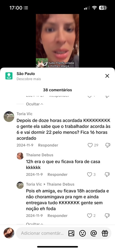 - “Pois é amiga, eu ficava 18h acordada… gente sem noção é foda”
